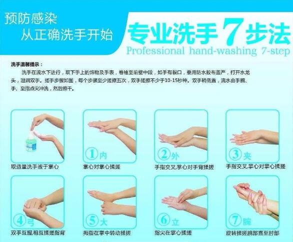 使用肥皂(洗手液)和流水搓手时间应不少于 20 秒。谨记洗手七字口诀。擦手时最好使用一次性擦手纸,如果没有,用洁净的毛巾擦拭,毛巾变湿时需及时更换。