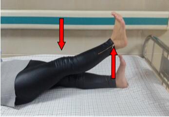 取仰卧位,膝关节尽量伸直,大腿前方的股四头肌收紧,踝关节尽量背伸,缓慢抬起整个下肢约15cm,保持5-10秒,再保持同样姿势缓慢放下,两腿交替以上动作。抬高、放下为一次,15次为1组,每天3组。