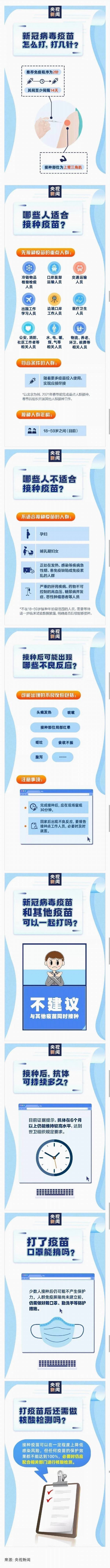 近日,我国首批新冠病毒疫苗开始对重点人群进行接种。疫苗需要打几针?适用于哪些人群?打完后能不能摘口罩?出现不良反应怎么办?今天,通过一组图,一起了解↓↓↓