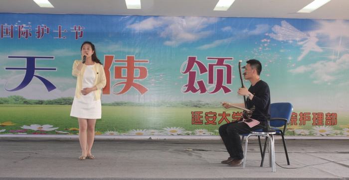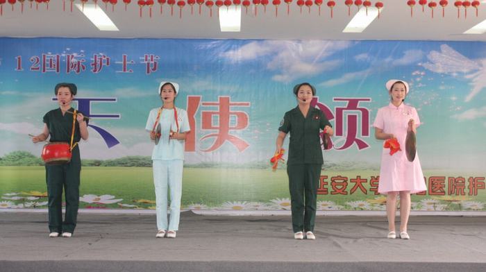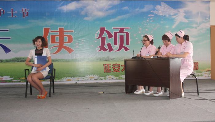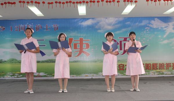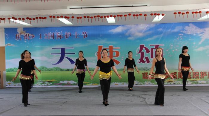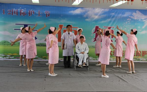 庆祝节目精彩纷呈,心脏系统的表演剧《我是一名护士》,从护士职业礼仪的站、坐、行、蹲、推治疗车、持病历夹等方面进行了护士礼仪展示,在优美的背景音乐衬托下,庄重而优雅,标准而婀娜的礼仪展示,如一场美妙的音乐剧,赢得了观众的阵阵掌声。秦腔表演《十五贯》片段,展示了我们护理人的多才多艺,其哥哥的板胡伴奏更为节目锦上添花。脑血管病系统带来了舞蹈《印度风情》,病房里,白衣天使展现的是她们轻巧娴熟的技术,而舞台上的她们舞姿轻盈优美,台下掌声和欢呼声此起彼伏。随后在磅礴的音乐伴奏下,四位护士缓缓走上舞台,此刻的她们美丽、纯洁、高贵、神圣,燕尾帽下的张张笑脸为我们谱写了大爱无疆的《天使颂》。女声独唱将《那片海》中执着的情感演绎的淋漓尽致。外科系统精心准备了三句半《护士真善美》,你看,她们敲锣打鼓、气势骄人,却用简捷、诙谐的语言,将外科各科职业的辛酸和快乐表达的活灵活现,时而感人至深,时而令人捧腹大笑。内科系统演绎的小品《招聘新时代》,将大会推向了高潮,演员们精神饱满、配合默契、诙谐幽默,将招聘时的各种状况表演的惟妙惟肖,赢得观众的频频尖叫声和喝彩声,让人不禁联想起了自己当年应聘的情景。外科系统、内科系统的娱乐节目:《快乐传真》和《萝卜蹲》更是让整个会场充满了开怀的笑声,成了欢乐的海洋。
