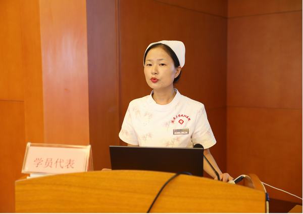 本期培训班优秀学员代表李露发言:她代表全体学员对院领导给予心血管专科护士培训班的大力支持表示感谢。她讲到2个月的培训使我们的理论知识在这里得到了补充,最前沿的诊疗新技术在这里得到了诠释,规范化操作流程和技术在这里得到了正确指导和掌握,并且和同事们结下了深厚的友谊。引领心血管专业高、精、尖技术的发展,我们会牢记使命,不忘初心,星星之火,拓荒燎原,在以后的工作中我们将以精湛的专科护理技术服务于患者,为心血管病院的发展贡献我们的一份力量。