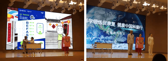 本次比赛,我院护理部高度重视,层层选拔人员,时时关注进度,并邀请具有比赛经验和演讲功底的老师进行全程指导。《肌细胞历险记》由张莎扮演肌细胞、灰猛强扮演患者王大爷、董星辰演绎康复专科护士,以肌细胞为第一人称生动的讲述了它的历险经历,而王大爷也形象的还原了生活中患者的真实情况,十分有代入感,康复专科护士则通过扎实的专业知识通俗易懂的指导患者正确康复运动,体现了康复专科护士在脑卒中患者康复过程中的价值。除此之外,作品还强调了快速识别脑卒中的重要性以及溶栓治疗的及时性。
