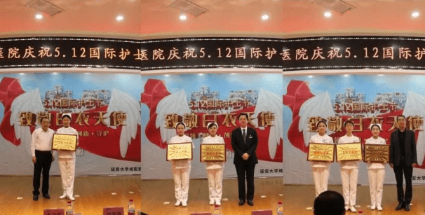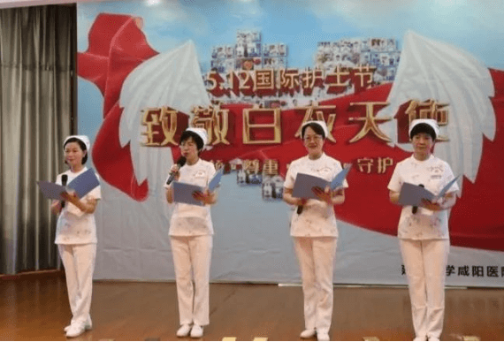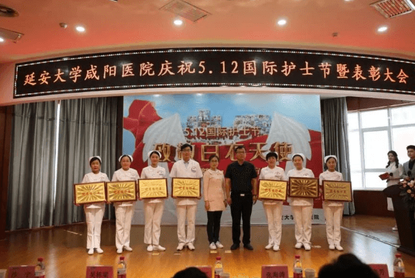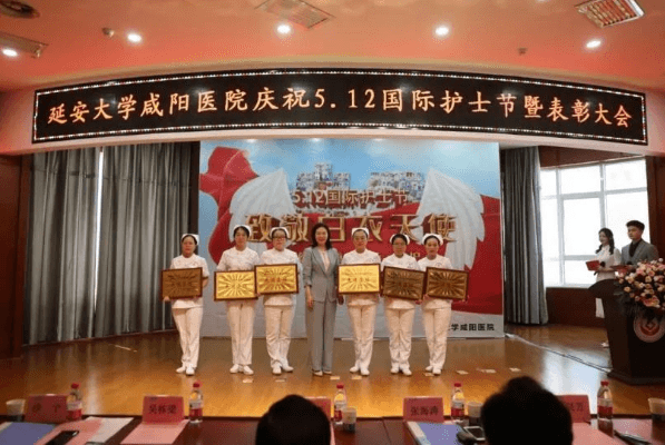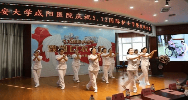 精诚医疗集团李卫军主席宣读了延安大学咸阳医院优秀护士(长)、优质护理服务先进集体、先进个人、临床护理教学先进集体、优秀带教老师表彰通报;工会沙宁主席宣读“淬炼精兵·守护生命”护理岗位技能练兵大赛奖励通报。