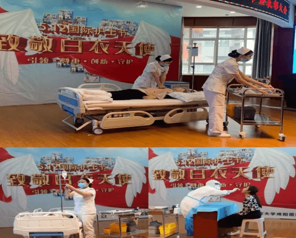 表彰大会结束后,举办了简单而隆重的庆祝活动,在“淬炼精兵·守护生命”护理岗位技能大赛中脱颖而出的心血管内科三病区梁康祎、耳鼻咽喉科赵妍护士、NICU李进护士护士分别进行了穿脱防护服与鼻咽拭子采样、静脉留置针输液、心肺复苏结合电除颤的汇报展示;