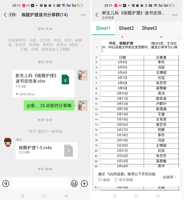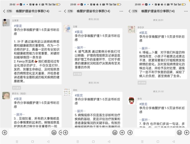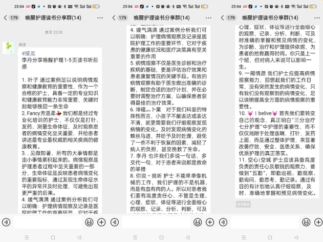 第一天读书分享后,我主动带头将听书后感想发至群内,护士姐妹们热情高涨,读书听书积极性很高,分别接龙分享了自己听书后的感想,丹丹护士表达“自己读一遍还是感觉不太一样的,一下子就领会了病情观察和健康指导的重要性”。芳芳护士分享“我们都是经过专业化培训的护士,不仅仅是打针、发药、测量生命体征,及时观察患者的病情变化至关重要,并给患者讲述最专业最权威的相关疾病的健康教育......”大家分别分享着自己的心得体会,沉浸在读书的氛围中……