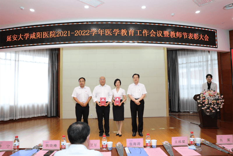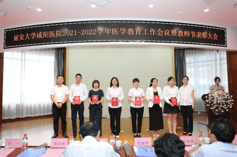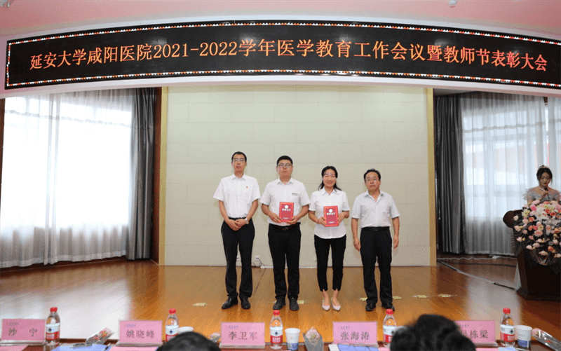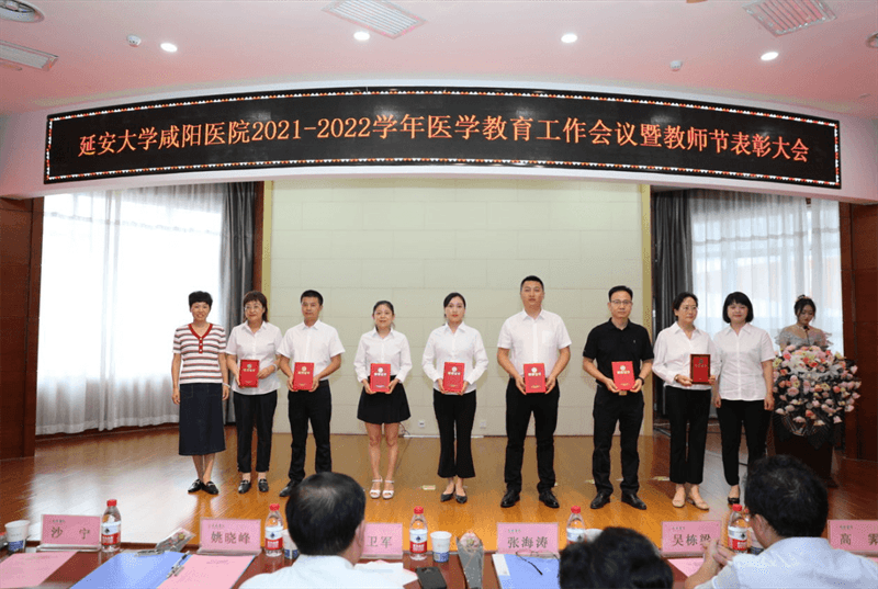 李卫军主席宣读了《延安大学咸阳医院关于表彰2021-2022学年优秀住培专业基地、优秀教研室、优秀保障科室、优秀带教科室和优秀带教老师的通知》的文件。各院领导给获奖单位及个人颁发了荣誉证书。