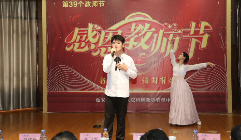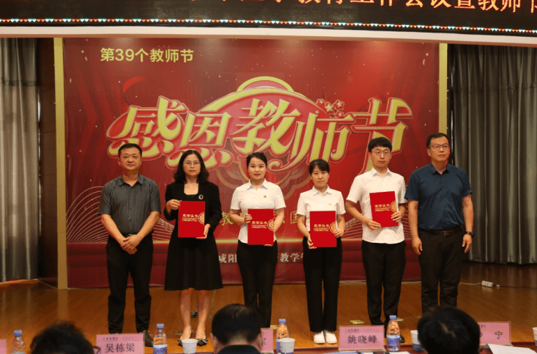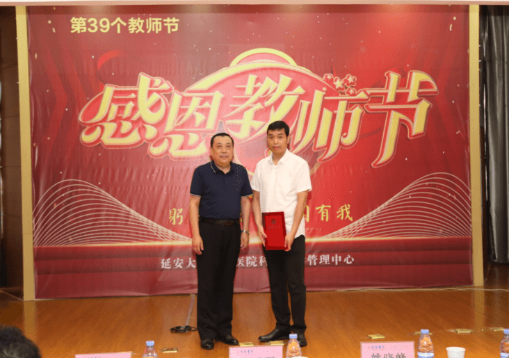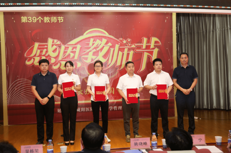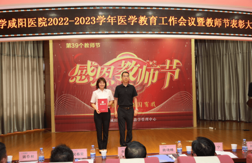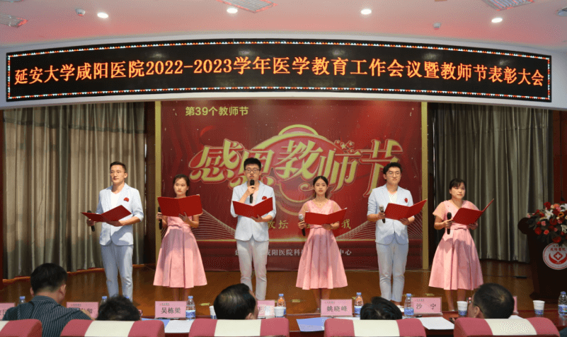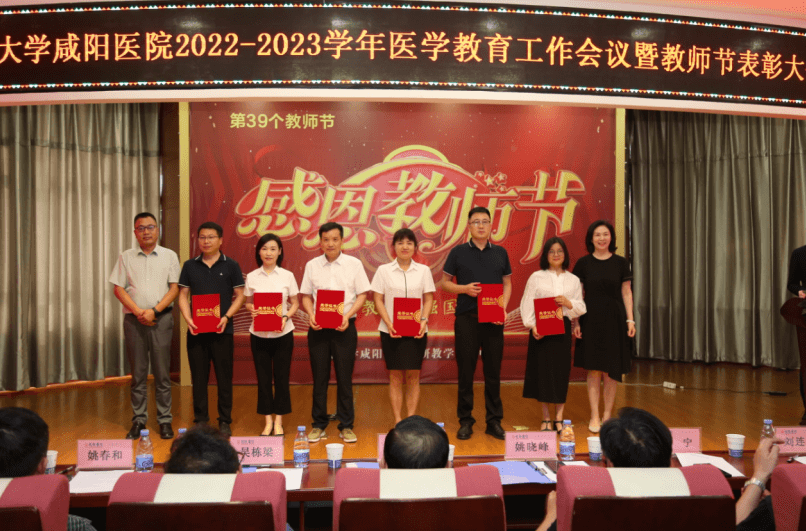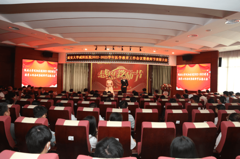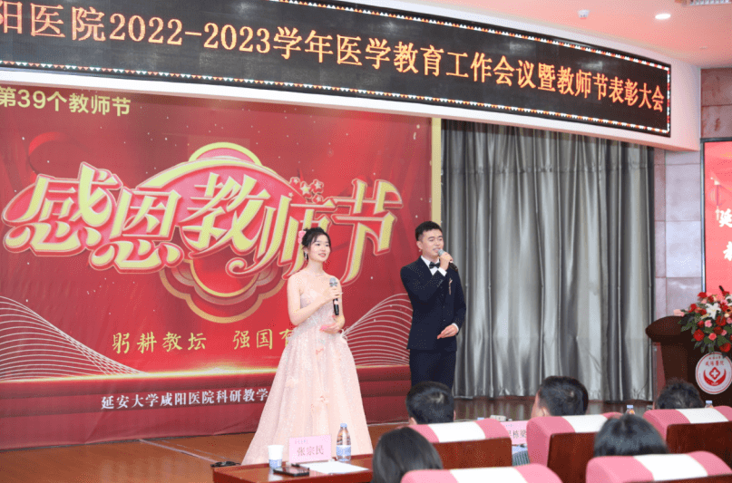 为热烈庆祝第39个教师节,2023年9月8日下午,我院在脑血管病院第三学术厅隆重举行了 “2022-2023学年医学教育工作会议暨教师节表彰大会”。精诚医疗管理集团主席李卫军、延安大学咸阳医院院长姚晓峰、常务副院长吴栋梁、行政副院长兼工会主席沙宁、外科病院副院长姚春和、院长助理刘连锋、院长助理张宗民、刘贝磊副总会计师、院长助理巨涛、内科病院副院长张玉河、科研教学管理中心副主任陈青、调研员韩晓芳、口腔病院副院长韦彦锋、精神心理病院副院长胡晓科、各职能部门负责人、临床带教老师、住培医师(含专硕研究生)、实习生代表等共200余人进行现场观看,本次会议由延安大学实习生安磊、武乐乐主持。