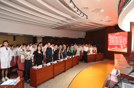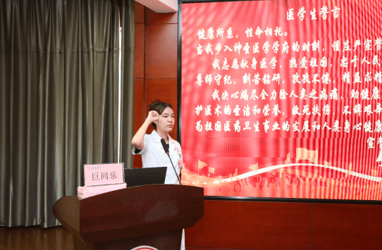巨同乐同学带领全体老师、见习生庄严宣誓,“健康所系,性命相托……”,穿着白衣,心有锦缎,少年不惧岁月长,彼方仍有荣光在,所有同学立志为医学事业奋斗终生。