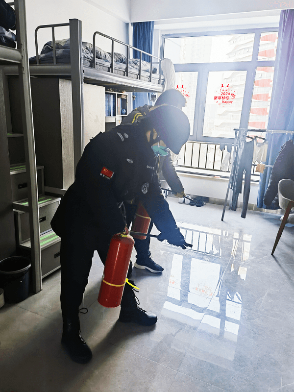 消防讲座结束后,从发现火情、求救求助、疏散逃生等全过程进行了演练,一阵急促的警报声拉开了“宿舍消防安全疏散演练”活动的帷幕,听到警报声,全员立即到达指定岗位,郭俊鹏科长、寇森队长指导学生快速疏散,听到指令后学生弯着腰、猫着步,捂住口鼻,沿着楼道快速前进,有序撤离到安全地带,随即清点人数,层层向上汇报。