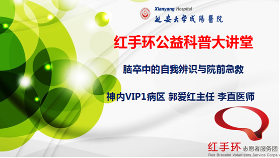 为进一步提高咸阳地区人民群众对脑卒中防治知识知晓率和控制率,倡导人民群众健康的生活方式,实现脑卒中的早期预防、早期诊断、早期治疗,降低脑卒中发病率、复发率、致残率及死亡率。11 月 04 日上午,我院神经内科贵宾一病区红手环志愿者服务团的志愿者们以实际行动,践行红手环精神,开展了红手环公益科普大讲堂,获得了巨大的反响。
