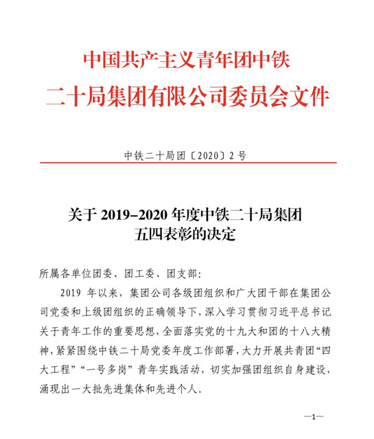 岁月如烟,流年似水。值此中国共产主义青年团九十八周年之际,我院团支部获得“2019-2020年度中铁二十局五四红旗团支部”荣誉称号;援鄂抗疫勇士张春妮同志获得“防疫战役好青年”荣誉称号;吴迪同志获得“2019-2020年度中铁二十局优秀共青团员”荣誉称号。荣誉不仅是对我院先进集体和优秀个人的肯定,更是对我院一年来团工作的肯定。