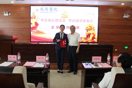 张海涛院长宣读了《关于表彰先进党支部和优秀共产党员的通报》表彰决定,对各支部推荐的理想信念坚定、工作成绩突出、受到党员群众一致认可的1个先进党支部,10名优秀党务工作者,37名优秀共产党员及10名“党员示范岗标兵”:张春妮、沙宁、赵莉、霍金莲、张绒、陈英、刘丽、谢昕、杨锐静、剌梅予以表彰。随后,医院领导为先进党支部、优秀党务工作者、优秀共产党员及党员示范岗标兵分别颁奖,鼓励他们再接再厉、戒骄戒躁、再创佳绩,也倡导全院共产党员以先进为榜样,进一步解放思想、立足本职、爱岗敬业、锐意进取,为医院的稳定发展努力奋斗。