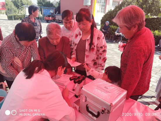 在阳峪村中心广场,广大群众慕名前来,村民们一大早就赶来等候医生检查。义诊团队携带听诊器、血压计、裂隙灯检查仪等医疗设备为群众进行诊断,现场进行慢性病登记,并为群众免费发放洗脸盆、手提袋、医疗保健书籍、常用药物等。在卫生院的大力支持和帮助下,活动开展的井然有序。义诊现场,我院专家们热情为群众诊断开方,耐心回答他们的咨询。