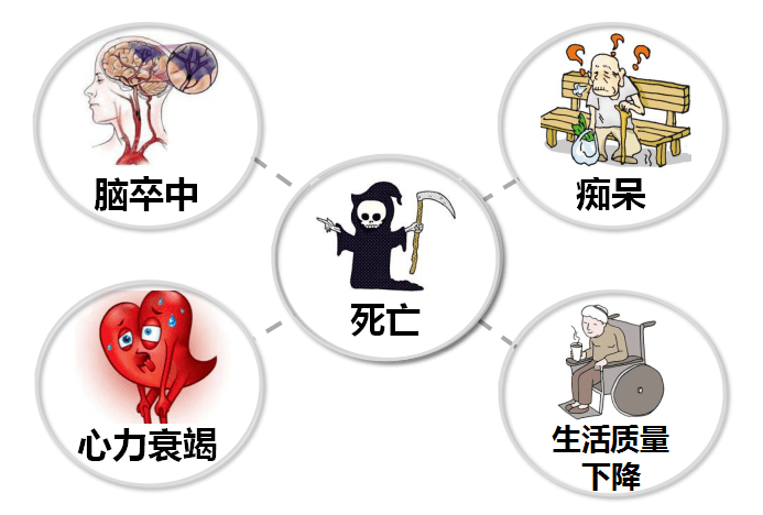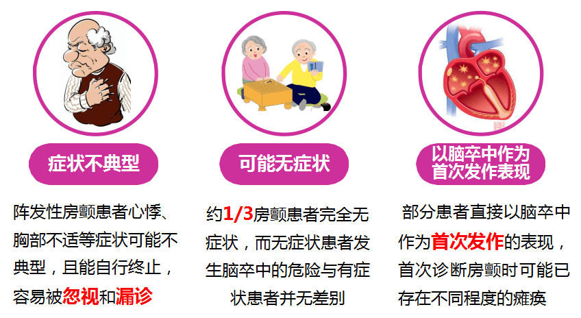 房颤症状可能不典型,1/3患者完全无症状,部分患者直接以脑卒中作为首次发作的表现,脑卒中是房颤最严重的危害,致残、致死率高。