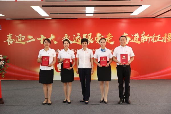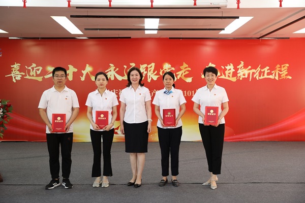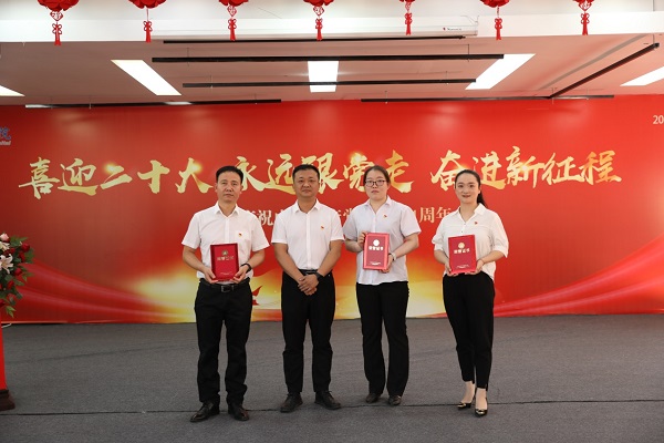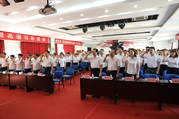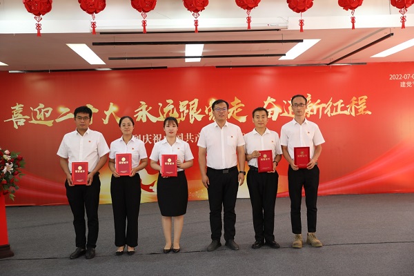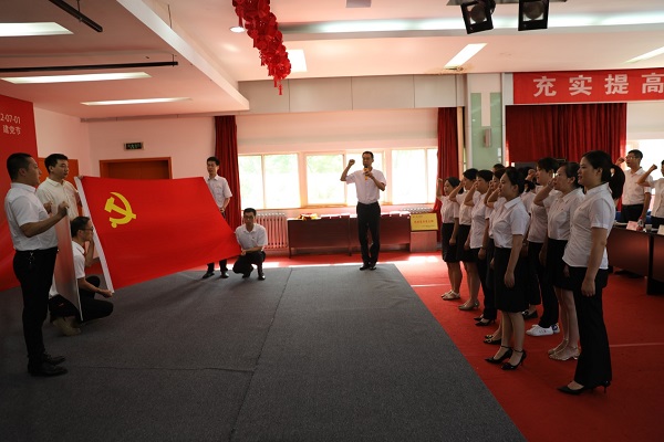 庆祝暨表彰大会在激昂国歌中拉开帷幕。党委委员、工会主席沙宁同志带领新入党同志和党员代表面向党旗宣读重温了入党誓词。简短、庄重的宣誓仪式让每一位党员的心灵又一次经历了洗礼和升华,也时刻提醒着每一位党员牢记自己共产党员的身份,要永葆初心使命,为共产主义奋斗终身。