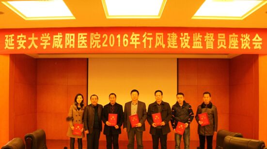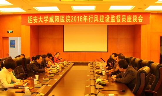 为进一步加强医院行风建设,促进医院更好、更快的发展,延安大学咸阳医院于11月24日下午,在心脏大楼二十楼会议会议室召开了“2016年行风建设社会监督员座谈会”,聘任市区主管部门、街道办、社区、高校、医药公司等社会各界知名人士9名为医院行风建设社会监督员。党委书记李卫军和院办公室、医务部、护理部、计财部、审计处、社区服务科、远程会诊中心、医患办、保卫科、各大楼综合办及接待科等部门负责人以及外聘行风社会监督员代表共23人参加了会议。会议由办公室副主任李鹏主持。