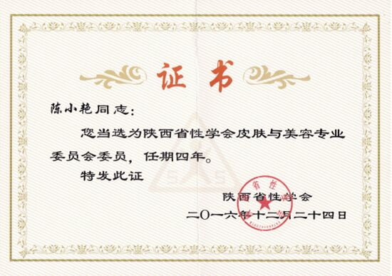 近日,从陕西省性学会获悉,我院皮肤科陈小艳同志被聘为陕西省性学会皮肤与美容专业委员会委员。
