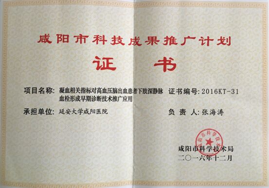 近日,据咸阳市科技局《关于下达“咸阳市二0一六年度科技成果推广计划”的通知》(咸政科【2016】184号)的文件,我院张海涛副院长领衔申报的科研项目“凝血相关指标对高血压脑出血患者下肢深静脉血栓形成早期诊断技术推广应用”成功获批为“咸阳市2016年度科技成果推广计划”项目!