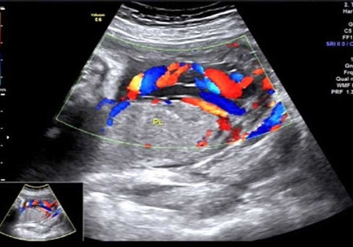 声像图示:脐带帆状插入胎盘并血管前置