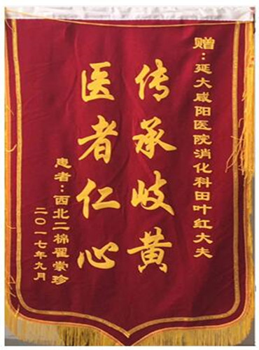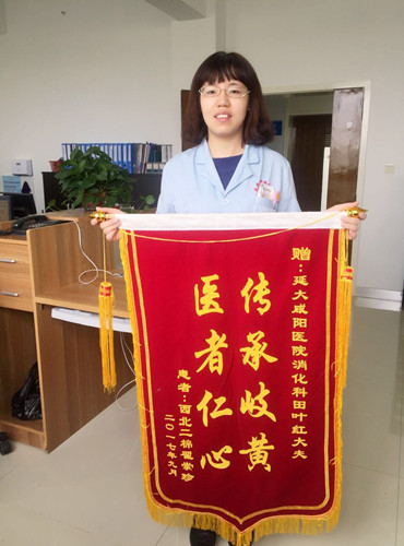 2017年9月29日,延安大学咸阳医院消化内科迎来了一位大约70多岁满脸笑容的老者。老者信步走入消化内科医生办公室,“我是来表示感谢的”说着他展开锦旗,红色的背景下映着“医者仁心,传承岐黄”八个大字。