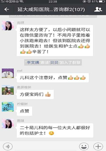 这是延安大学咸阳医院宝宝健康咨询群内的一段对话。自从延安大学咸阳医院儿科建立宝宝健康咨询微信群后,有许多儿童患者家长加入到这个群里。每天,儿科的医生都利用业余时间,接受儿童家长的咨询,并通过微信群,传递儿童生长发育的健康知识、儿科新技术新设备和对患者进行随访指导等。儿童家长有就医方面的问题可以先向群内医生咨询,确定需要就医后再来医院就诊,避免了盲目就医。儿童家长在不出门的情况下就能及时准确获取到健康咨询、用药指导等医疗帮助,缩短了医生与病人之间的距离,加强了医患沟通。