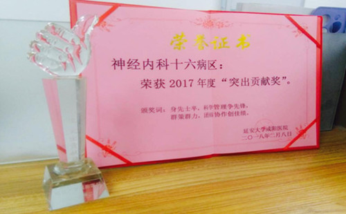 在我院召开的2017年年终总结暨表彰大会中,设立了一个特殊奖项—“2017年度突出贡献奖”。经过院领导的重重审核,神经内科十六病区从全院五十多个临床科室中脱颖而出获此殊荣。
