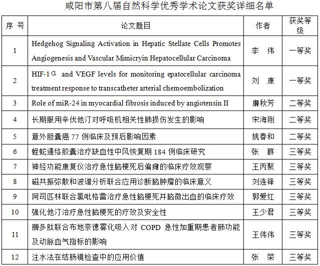 自然科学优秀学术论文是衡量我院科研学术水平的重要参考标志。多年来,我院始终重视高水平论文的成果产出和论文质量的提升,并已连续入选多届咸阳市自然科学优秀论文奖,这一成绩的取得与医院领导高度重视、良好的学术氛围,科研人员刻苦学习、勇于创新的精神密不可分。今后,我院将在此基础上,继续深化医护人员继续教育、本科生带教、研究生教育等改革,完善质量保障与监督体系,进一步提高我院科研成果的产出,为推动本地区发展作出积极的贡献。