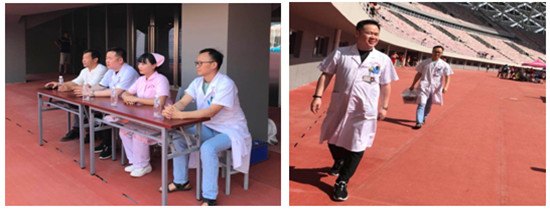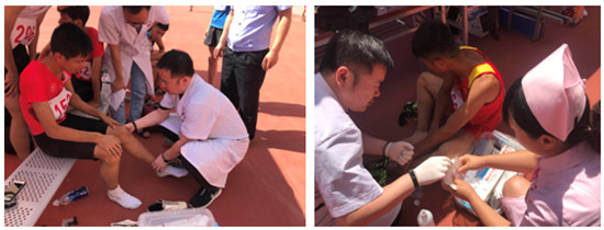 他们去的最早,走的最晚。看的最认真。当然,他们关注的不是精彩的比赛。他们全神贯注,紧张的眼神快速扫描着赛场里每一个运动场所和每一个运动健儿。赛场上瞬息万变,运动员随时会受伤。一有情况他们马上上前处置。3天来,处理急性损伤6人,送院就诊1人,圆满的完成了比赛期间医疗保障工作。受到陕西省田径管理中心及咸阳市体育局领导的肯定。