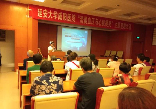 为了提高健康教育质量,为了广大患者能更好的预防疾病,延安大学咸阳医院心血管病院制定了每月一主题健康教育宣传活动计划。2018年7月11日下午16时,新的一期“清晨血压与心肌梗死”主题宣讲活动在心血管病院20楼第一学术厅举行,会议由张红护士长主持,医护人员和心脏科病人及其家属100多人参加会议。