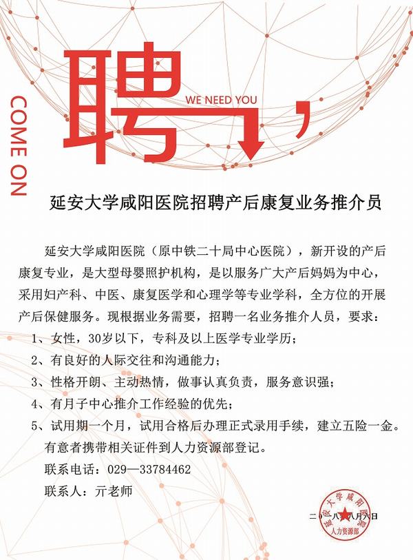 延安大学咸阳医院招聘产后康复业务推介员
