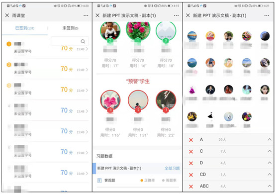 智慧课堂应用实战培训中,李翠老师就“雨课堂基本使用方法”进行了详细讲解,李伟老师、陈青老师分别通过实战课堂教学,带大家将雨课堂的各个功能体验了一次,分别通过对课前预习PPT学习情况的通报,确定了课堂教学的重点,在课堂教学过程中展现了雨课堂投票、答题、红包、弹幕、随机点名等功能,并在结束学习后和大家共同分析了学习报告,发现了存在问题,让老师对课堂教学的把控更加有效。对于使用雨课堂后的教学效果,现场各位老师赞美有加,“使用雨课堂可以了解学生的预习情况,包括有哪些同学完成预习,哪些没有完成预习,预习到哪一页,有哪些页有不懂的等。这些数据,让他切切实实地掌握学生的预习情况。”、“雨课堂极大地拉近了我们年轻教师与学生之间距离,消除了代沟和隔阂,活跃了课堂的气氛。”