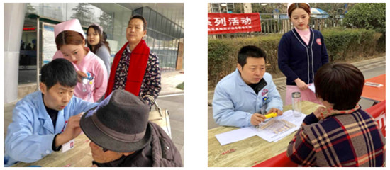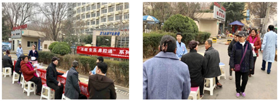 当日上午9点,耳鼻咽喉科在本院大门口,车辆往来如织的文林路旁,流动人口密集处,设立桌椅,拉起“爱耳,音亮,鼻腔通系列活动”及印有本次活动主题的横幅,向来往行人,进行免费义诊公益活动。我院耳鼻咽喉科主任张立刚亲自坐阵,带领科室医务人员为市民进行免费检查咨询及发放宣传资料等。