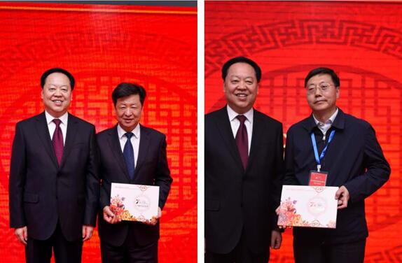 精诚医疗集团董事局主席张群为支持医院发展的上级领导和医院历任老领导分别颁发“七十华诞感恩纪念章”和“七十华诞发展功勋奖”
