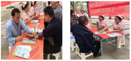 活动现场摆放的高血压健康知识展架,简单易懂、图文并茂的宣传手册,精神风貌良好的医护团队无不显示着我们的精心准备。义诊开始,大家秩序井然依次进行血压的测量、咨询、综合评估、健康宣讲等。