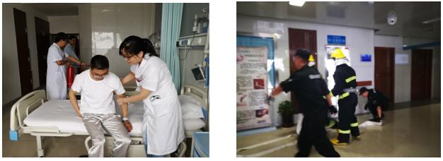 16点30分,演练拉开帷幕。在值班护士发现火情后,立即启动应急预案,在刘勇责任总医师和罗建利护士长统一指挥下按职责分工迅速展开行动。全体医务人员协助科室患者按疏散路线有秩序地撤离,到达指定地点汇合。同时,现场灭火救援、人员疏散、医疗保障、人员救护、信息协调等一系列工作紧张而有序开展。接到火警电话后,保卫科人员也迅速赶到,扑灭明火,确保火情可控。