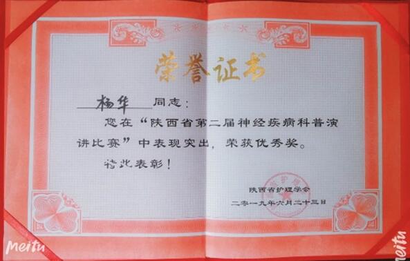 2019年6月23日,陕西省护理学会在西安市举办为期两天的“神经疾病新技术、新业务及危重症护理学习班”暨“第二届神经病科普演讲比赛”。我院重症医学科护士杨华参赛并取得优秀奖。参加本次比赛的有陕西省各医院神经内外科、重症监护室、急诊、康复等专业的护理骨干和神经脑病护理专业委员会全体委员。