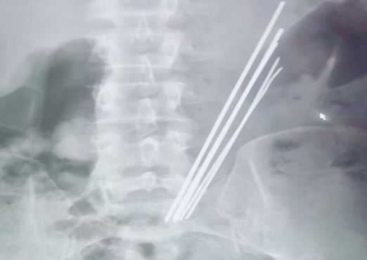 2019年10月30日,延安大学咸阳医院内镜中心一如既往,仍是一番忙碌景象。电话响起,我院普外科二病区来电,科室就诊了一位特殊患者,又一例消化道异物,与此前不同的是,这位病患的异物已吞入达3年之久,间断腹痛,未予重视及治疗,近来因脐周疼痛逐日加重,就诊于多家医院,无一例外,均建议手术,患者及家属疲于奔波,最终无奈接受,遂来我院要求行手术治疗。主管医师接诊后积极询问病史,完善相关检查,令人讶异的是,3年时间异物依旧潴留于胃腔之中,腹平片提示为多个长条状金属异物,棘手之处在于患者拒绝提供关于异物的详细信息。听闻我科上次胃内异物取出报道,主管医生抱着试试看的态度打通了内镜室的电话。