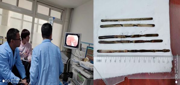 李恒副主任医师详细了解上述情况后,立即与内镜中心麻醉师张玉河医生沟通,暂时无法确认异物是否嵌顿入胃壁,以及其嵌入深度,普通胃镜的刺激极有可能加剧患者痛苦,为异物取出造成阻碍,无痛胃镜相对而言,患者痛苦较小,避免了配合度不高等情况,但与此同时,因异物存留于胃腔内时间较长,考虑金属质地,且数量较多,操作过程中必然会面临很多棘手问题,并发呼吸困难、大出血的风险。消化内科一病区李主任和麻醉医师张玉河认真翻阅患者相关信息,制定出严谨、详尽的治疗方案。征得患者及家属同意后,又一场攻坚战展开了......进镜至胃腔,可见5个长条形金属异物滞留,表面光滑,粘液附着,抓取难度非常之大,需在胃腔内不断调整方向,确保异物以竖直状态随胃镜缓慢退出,避免异物通过食管及口腔时造成的二次损伤,经过反复不懈努力,最终异物全部安全取出,长条状金属异物最长达16cm左右。患者家属难掩兴奋之情,不停的念叨着“谢谢,谢谢”,内镜下的异物取出让他们的亲人免受手术之苦,同时也减轻了经济负担。
