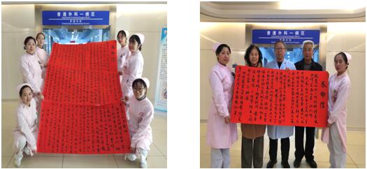 一大早普通外科一病区就热闹了起来,三位出院患者及家属就像约好了一样,给我们科室送来了锦旗及感谢信。其中刘阿姨术后出院刚两天,就微信发来了一封电子版感谢信,今天又特意用大红纸,一字一句足足写了三大张,“闭目回思当时景,我不由的心潮澎湃,似万涛翻滚久久不能平静……。在我术后的那些天可苦了年轻的护士们。她们是姚婷、刘昱宏、曹婷、郑莹莹,和许多不知名的白衣天使,她们不分昼夜地细心照顾我,她们就像天降甘露滋润着我这个像沙漠里的一颗即将枯死树木的心田……”刘阿姨的感谢信,情真意切,她赞扬护士们“护理技术高超,交接班认真负责,态度和蔼可亲,柔声细语,不时地问寒问暖”。