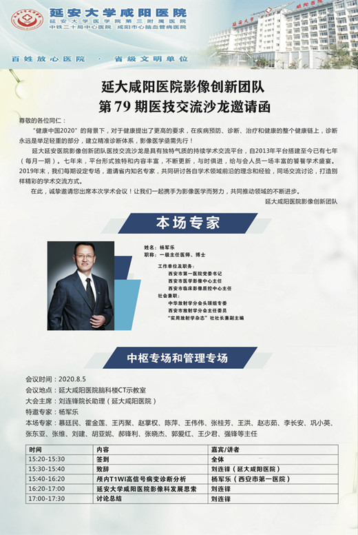 2020年8月5日,我院医学影像科在脑血管病院CT/MRI示教室举办第79期“医技交流沙龙”活动,本次邀请到授课专家为西安市放射学分会主任委员杨军乐教授,与他一同莅临我院的还有渭南市第一医院医学影像中心贺映波主任、蒲城创伤医院党办主任兼CT室赵金平主任及陕西中医药大学第二附属医院医学影像中心贺朝主任。