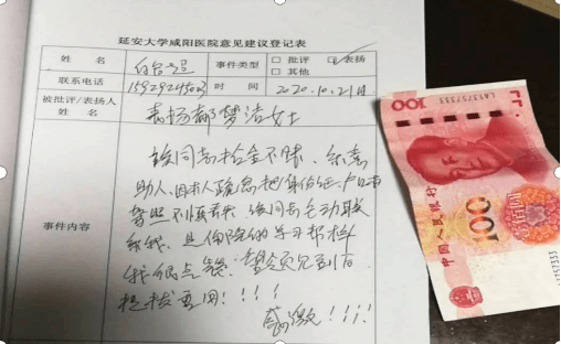 2020年10月20日,延安大学咸阳医院心血管病院收费员都梦洁在收费室窗口捡到一个钱包。于是拿回科室上报保存,为了快速找到失主,她打开钱包,里面有(身份证、银行卡、驾驶证、少许现金),通过各种途径查询此失主在医院曾留下的电话号码,第一时间联系到失主,失主在电话里激动地说他找了好久,并约好21日来取。第二天,失主来后经收费员认真核对身份,确认无误后将物品归还失主。此时,失主激动地紧紧握住工作人员的手并连连道谢,且为收费员留下感谢信。为了表示感谢,还在感谢信里夹了100元现金以表谢意。收费员连忙挥手说,不要不要,这是她们应该做的。看到收费员再三拒绝,失主转身边挥手边说:“拿着,拿着,面带微笑并离开。”但由于当时窗口患者排队较多,为了不影响其他患者挂号缴费,收费员未能及时起身归还。(现金已上交医院廉政账户)