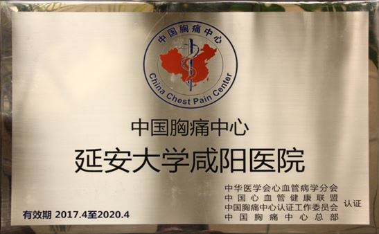2017年4月6日,中华医学会心血管分会,中国胸痛中心认证工作委员会,中国胸痛中心总部公告,延安大学咸阳医院通过2017年第一批中国胸痛中心标准版认证。成为陕西省咸阳市首家获得国家认证的胸痛中心。