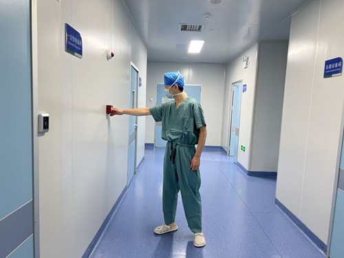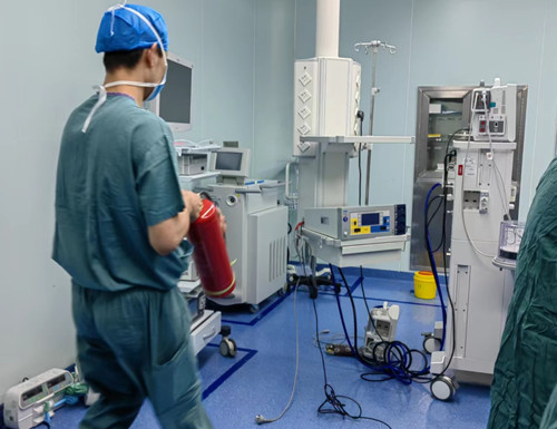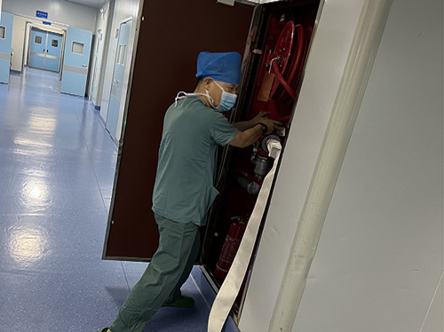 王志涛主任立即打开就近的消火栓连接接口,高怀东将消火栓拉至第一手术间栓口对准着火点进行灭火,手术台上人员做好患者伤口保护,陈思言协助麻醉师郝磊准备简易呼吸气囊及全麻急救包。
