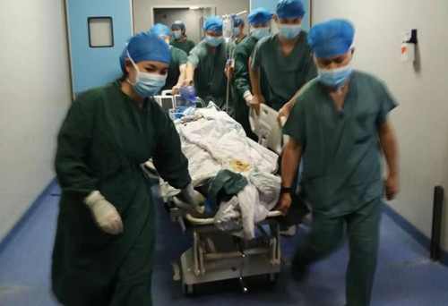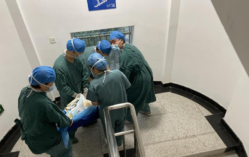 槐金霞护士长上报外科病院,通知各手术间转运病人撤离,各手术间洗手护士协助手术医生包扎伤口,麻醉师连接好简易呼吸气囊及全麻急救包,巡回护士准备好转运工具。医务人员一起将患者抬至转运车上,槐金霞护士长快速断掉第一手术间的电源,王志涛主任指挥将患者从病员入口通道抬下撤离,并将转运车靠边放置,以免影响其他人员疏散。槐金霞护士长指挥第四手术间人员将患者从一、二手术间中间(北边安全通道)的安全疏散通道撤离。办公护士康雪维指挥第七手术间人员将患者从第八手术间后门(通往重症医学科安全通道)的安全疏散通道撤离。