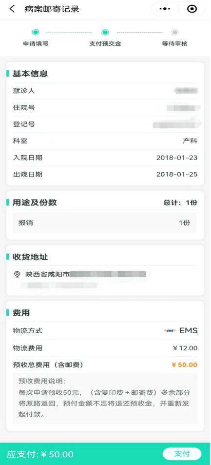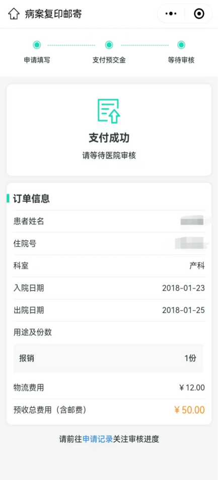 您申请的病案已寄出,请前往病案申请记录关注物流并及时取件。如有疑问,请拨打病案科电话:029-33111385。