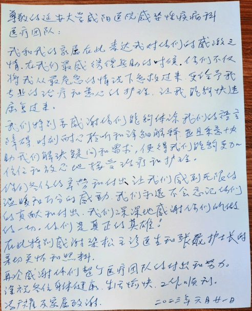 “我和我的家属在此表达我对你们的感激之情,在我们感到彷徨无助的时候,你们不仅将我从最危急的情况下救过来,更给了专业的治疗与精心的护理,真是太感谢你们了!”端午前夕,来自香港的患者写下了这封真挚的感谢信。
