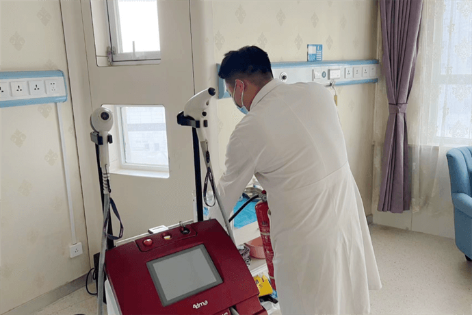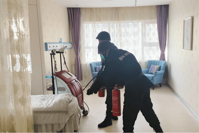 当班医生就近取出灭火器,前往VIP2室查看火势,进行灭火。