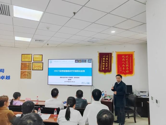 下午三点半,会议正式开始,张涛副主任致欢迎辞,并隆重介绍金晨望教授及其团队。随即,金晨望教授就“HRCT在呼吸慢病诊疗中规范化应用”进行深入浅出地讲授,首先对HRCT的概念进行了基础的讲解,金晨望教授指出呼吸慢病目前已成为重大的公共卫生问题,而HRCT的应用,可以尽早筛查此类疾病,做到早发现、早治疗。接着又通过实际病例,对间质性肺疾病等进行了系统的讲解,展示了“蜂窝征”的演变过程及相应CT表现,对间质性肺异常的三种类型的不同影像表现及其鉴别诊断做了详细的阐述。最后,向我们介绍了目前HRCT在呼吸慢病中的临床应用,并展示了金晨望教授团队在此方面取得的丰硕的成果。