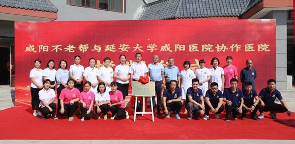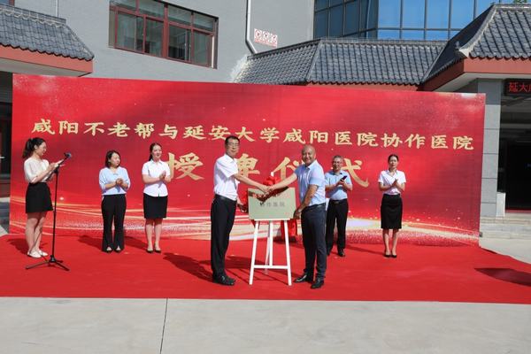 7月13日上午,延安大学咸阳医院院长助理沙宁、宣传部部长赵莉、宣传部科长宋瑶及各科室专家一行,赴咸阳市渭城区“不老帮”智慧健康养老中心举行共建协作医院签约暨揭牌仪式。咸阳不老帮智慧养老有限公司董事长王烨、总经理王茸茸等领导和职工代表出席了仪式。