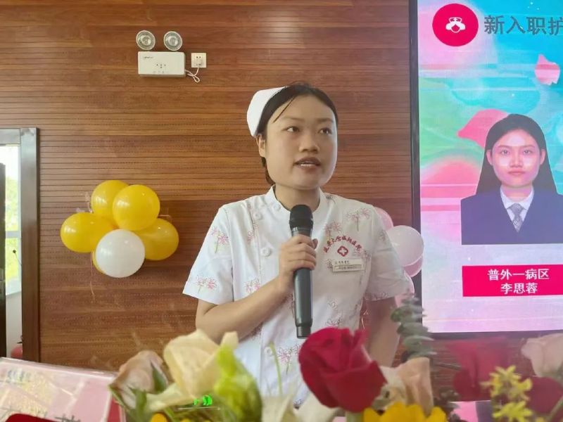 李思蓉代表新入职护士发言:作为新入职护理人员,要始终秉承南丁格尔精神,在学习上努力拓宽见识、在工作上不断提升能力。希望通过本次规范化培训理论课程的学习,不断完善自我,善于学习,勤于思考,在工作中做到理论联系实际,立志做一名有爱心、耐心和责任心,患者和家属信任的护士。